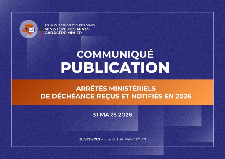 Le Cadastre Minier publie la liste des Arrêtés ministériels de déchéance reçus et notifiés en 2026, conformément à l’article 289, alinéa 2, du Code Minier.